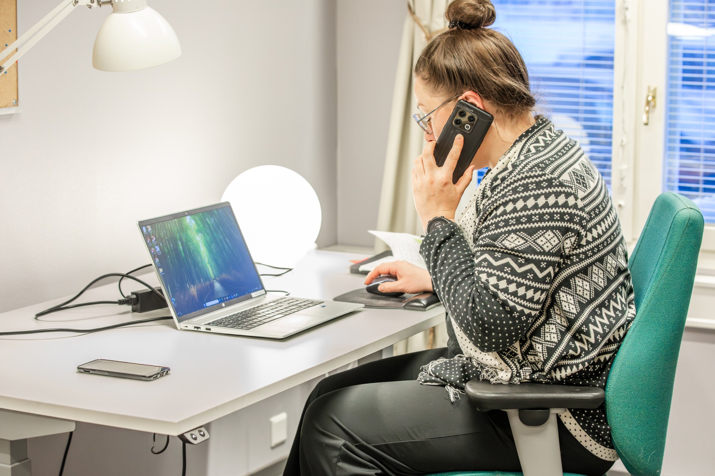 Tilassa on sähköinen työpöytä ja työtuoli. Verhot ovat pimentävät.