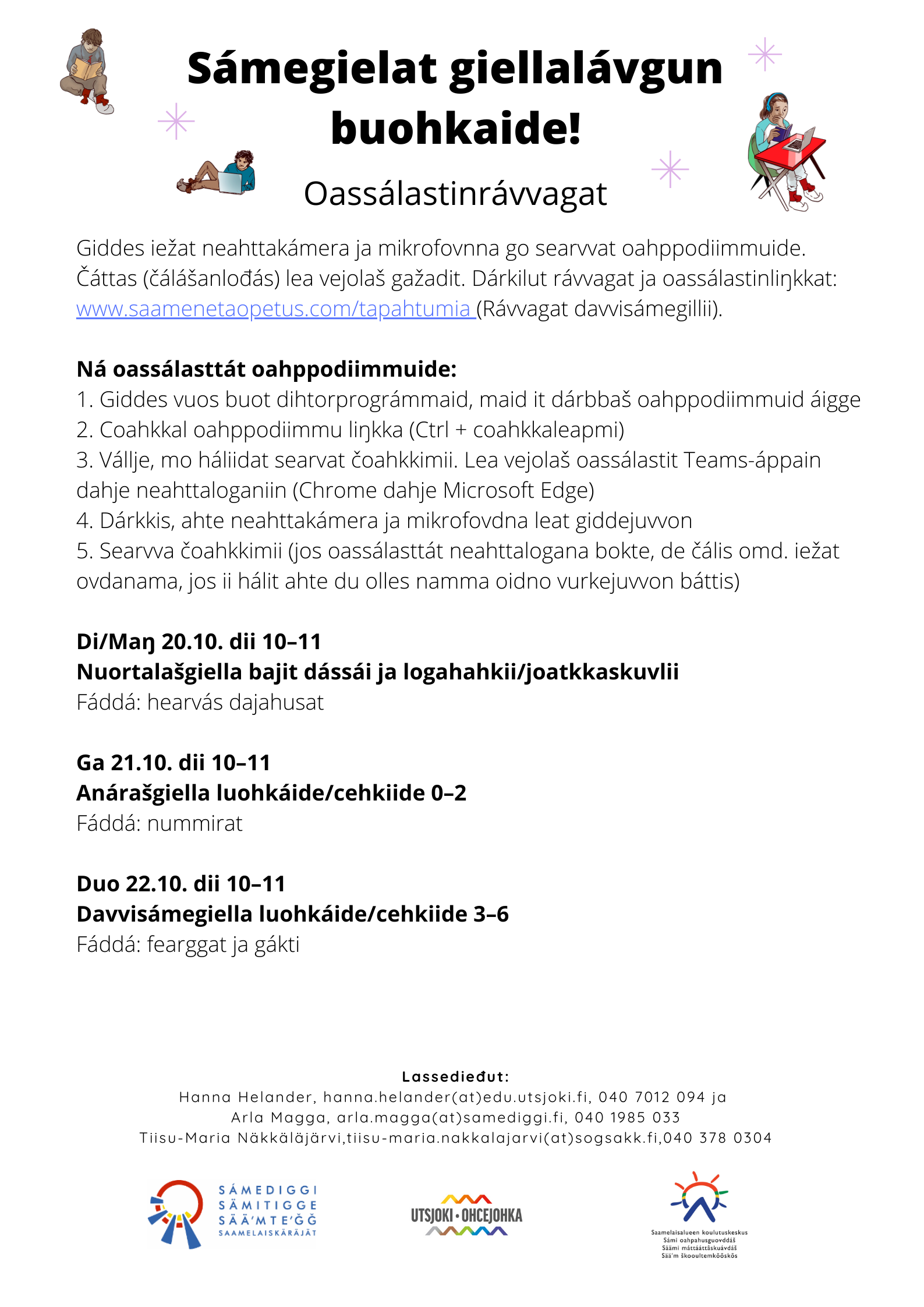 Oahppodiimmut dollojuvvojit Microsoft Teams bokte. Gávnnat vuolábeale govas oahppodiimmuid áiggiid, fáttáid ja oassálastinrávvagiid. Gávnnat suomagielat rávvagiid ja njuolggoliŋkkaid Teamsii dáppe.